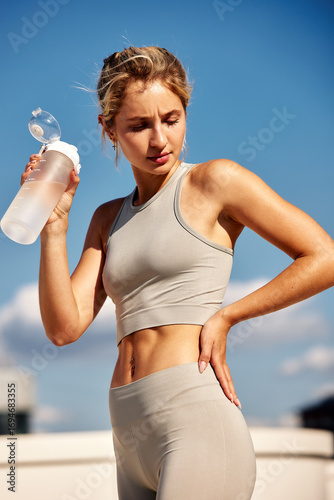 Fitness woman hydrating with water bottle during outdoor workout under sunny skies