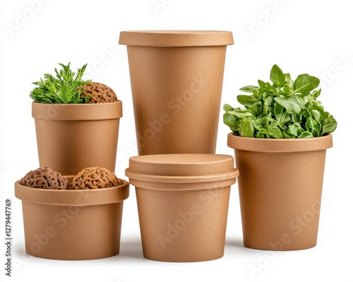 biodegradable, container, cardboard box, environmentally friendly, sustainable, brown, herbal, plant, dirtied, pot, organic, natural, environmentally friendly, recycling, disposable, green, herb, white background, studio shot, grow, gardening, cultivation, agriculture, harvest, fresh, healthy, eco, reuse, reduce, reusing, minimal, simple, clean, composition, still life, photo, image