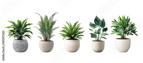 five decorative potted plants arranged in a row showcasing various green foliage styles and textures ideal for enhancing indoor aesthetics and promoting a calming environment