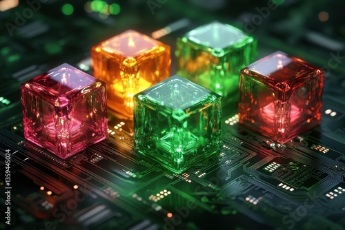 Five illuminated glass cubes sit on a modern electronic circuit board. Use this for tech, innovation, or abstract futuristic concepts.
