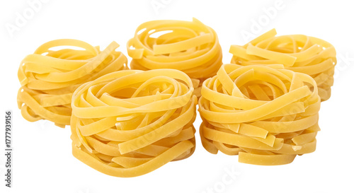 Five nests of uncooked yellow fettuccine pasta, arranged in a cluster, PNG isolated on white or transparent background