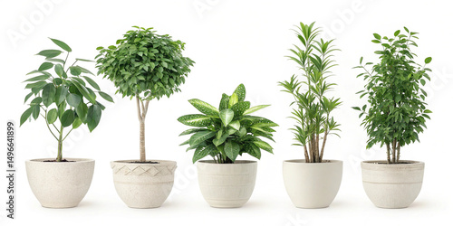 Five potted plants arranged in a row against a white background