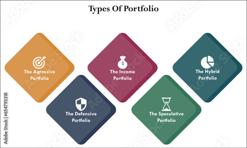 Five types of portfolio with icons and description placeholder in an infographic template