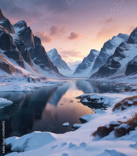 Fjords and mountains in the Arctic winter scenery, frozen waterfall, landscape, mountain