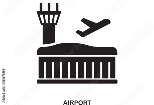 aerodrome, aeroplane, aircraft, travel, transport, aviation, control tower, icon, symbol, graphic, take-off, departure, logistic, terminal, transportation, journey, flight, airline, silhouette, black-and-white, graphic design, vector, industry, global, modern, simple, clean, air transport, flying