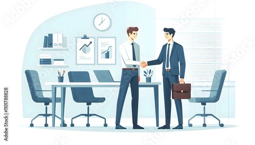 Flat Business Partners Sealing Deal Handshake Vector Illustration of Success in Bright Office
