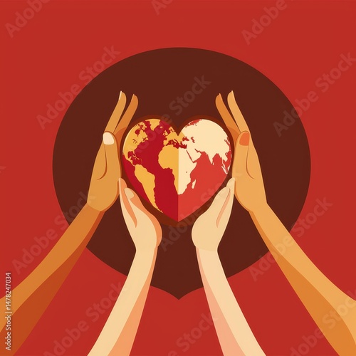 flat design diverse hands holding a heartshaped globe varied skin tones warm red and gold accents .