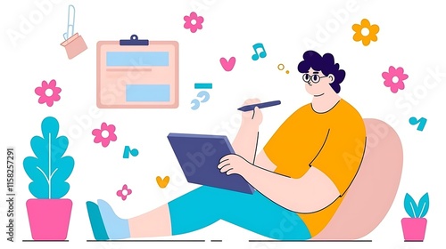 Flat design of a UX/UI designer sketching on a tablet in a minimalist workspace