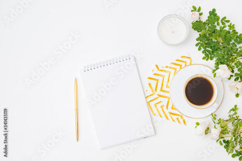 Flat lay blogger or freelancer workspace with mockup notebook and cup of coffee, napkins, small flowers and green leaves on a white background