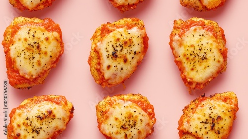Flat lay of baked chicken parmesan bites on pink background.