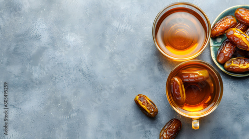 eid, ramadan, islam, islamic, religion, holy, flat, lay, of, date, and, tea, on, concrete, background, with, copy, space, for, text