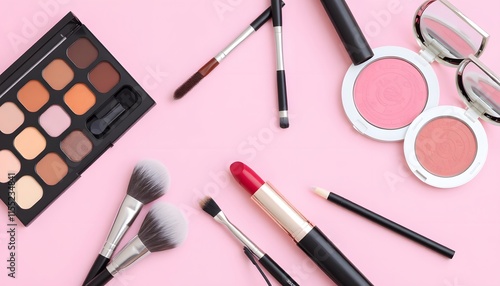 Flat Lay of Makeup Products on a Pink Background