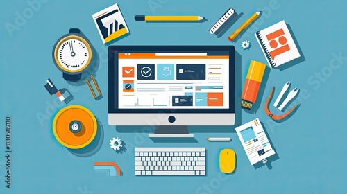 desktop, computer, keyboard, mouse, office, supply, work, business, technology, digital, design, marketing, website, cyberspace, online, datum, tool, equipment, productivity, efficiency, strategy, planning, management, development, creativity, innovation, idea, solution, project, teamwork, collaboration, communication, information, graphic, element, icon, illustration, concept, modern, flat, colourful, background, workspace, desk, table, stationery, time