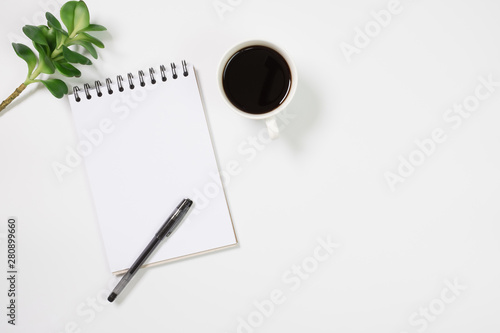 top, notepad, desk, white, view, table, notebook, office, background, note, plant, blank, paper, isolated, flat, space, work, up high, pen, business, design, crayons, empty, open, lay, hot drink, book, copy, education, concept, workplace, page, post, agenda, cup, up, text, modern, sketchbook, diary, object
