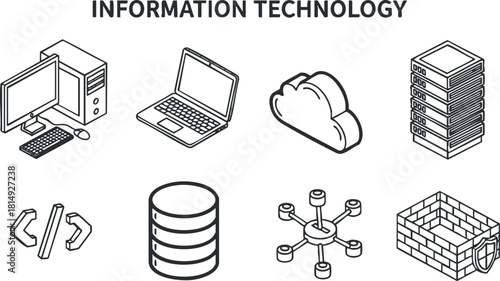 information, technology, computer, laptop, cloud, database, server, coding, network, security, icon, digital, datum, system, cyberspace, software, hardware, communication, development, connectivity, application, design, flat, outline, vector