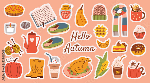 Flat style autumn stickers set with cozy elements like knitting, hot drinks, slippers, pies, and more. Ideal for seasonal designs, bullet journals, scrapbooks, and creative projects.