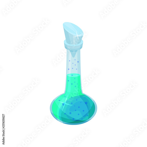 Flat vector icon of glass bottle with potion. Bright blue liquid. Magic elixir. Mobile game asset