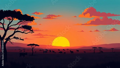 purple, scene, warm, savanna, grass, colours, flat, silhouette, african, landscape, africa, vibrant, artwork, horizon, stock, plain, red, illustration, nature, art, sky, yellow, exotic, vector, file, tree, tropical, digital, orange, image, design, sunset, download, sun, background, wildlife, photo, minimalist, graphic