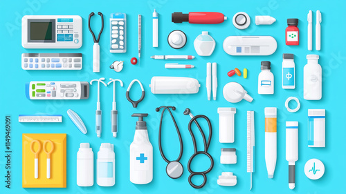 flat vector illustration of various medical equipment and supplies, including stethoscopes, syringes, and pill bottles, arranged on blue background