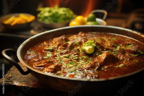 Flavorful beef curry in a large pan, ready to serve. A rich and spicy ethnic meal.