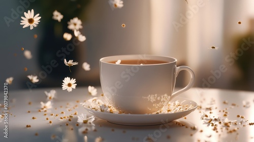 Flavorful chamomile tea in a delicate porcelain cup with floating blossoms for a soothing experience.