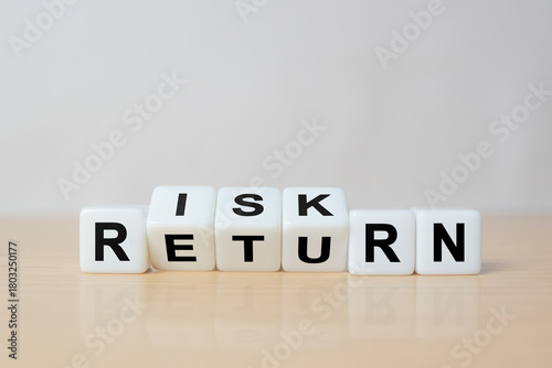 Flipping of dice which print screen risk and return wording. Investment concept about balance between risk and return