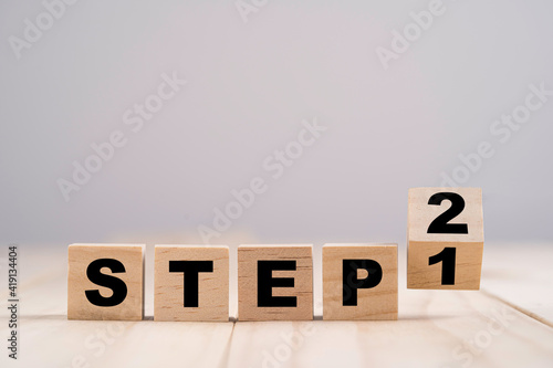 Flipping wooden cubes block for changing step 1 to step 2 on wooden table.