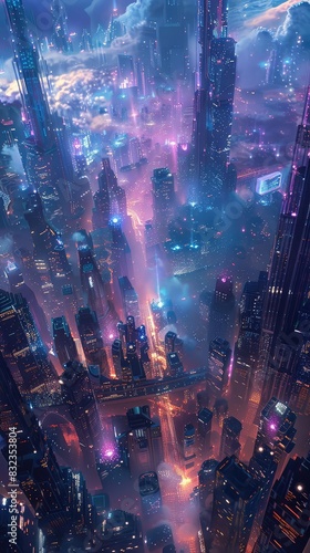 Floating futuristic buildings connected by sky bridges, holographic displays, vibrant blues and purples, 3D rendering, imaginative and advanced,