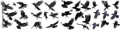 flock of flying crows , a black raven in flight, Wildlife-themed, cutout, isolated, photorealistic illustrations on isolated on transparent background PNG, cut out