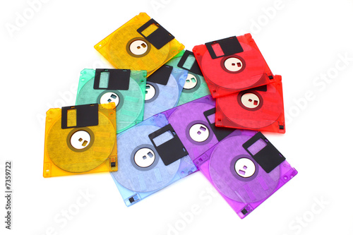 computer, orange, blue, green, colourful, coloured, colours, vibrant, saturated, digital, disc, floppy disk, floppy, white, media, old, obsolete, technology, object, stacked, pile, background, scattered