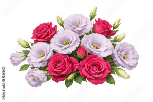 Floral arrangement with pink roses and light purple eustoma, delicate bouquet for celebrations and romance, transparent background