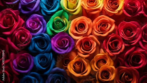 Floral background with rainbow colored roses top view. Beautiful rainbow colored rose close up. Macro rose on the table. Colorful rainbow rose with petals. Panorama. Banner. Space for text and design