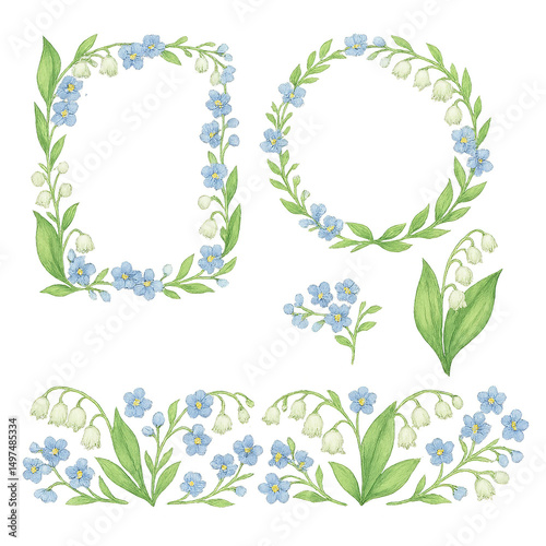Floral Elegance: Charming botanical illustrations featuring Forget-me-nots and Lily of the Valley, presenting various floral frame designs. A blend of delicate beauty.