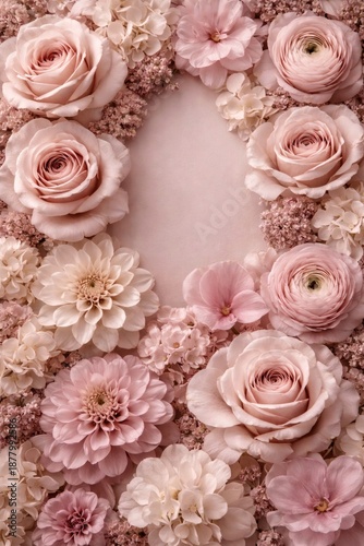 flower, frame, rose, floral, background, chaplet, border, flower petals, bouquet, garden, pink, pastel, arrangement, copy space, center, elegant, wedding, romantic, decor, design, invitation, greeting, feminine, botanical, natural, template, layout