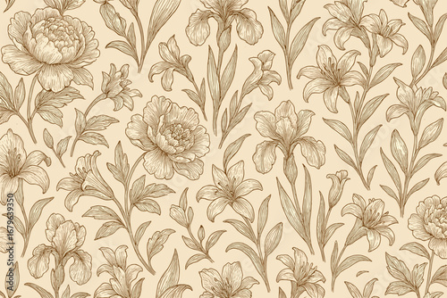 floral, pattern, peony, iris, beige, background, delicate, design, interior, decor, textile, botanical, illustration, elegant, wall, covering, flower, nature, artwork, plant, life, leaf, motif, seamless, vintage, style, home, traditional, art, luxury, print, natural, element, textile, flower, soft, colours, beauty, classic, decorative, printed, fabric, wallpaper, pastel