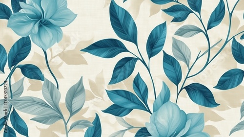 floral, pattern, flower, leaf, blue, cream, botanical, nature, design, background, illustration, art, decorative, elegant, seamless, texture, wallpaper, graphic, artistic, blossom, plant, stem, spring, summer, aesthetic, gentle