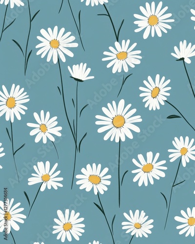 floral, pattern, daisy, white flower, blue background, nature, spring, art, design, elegance, decoration, romantic, vibrant, fresh, botanical, garden, sunshine, cheerful, textile, wallpaper, wrapping, aesthetic, creative, natural, summer, growth, beauty, artistic, simplicity, seamless, stylish, delicate, leaf, modern, joyful, bright, graphic, background, colourful, hand-drawn, hand-made, print, fabric, visual, unique, peace, calmness