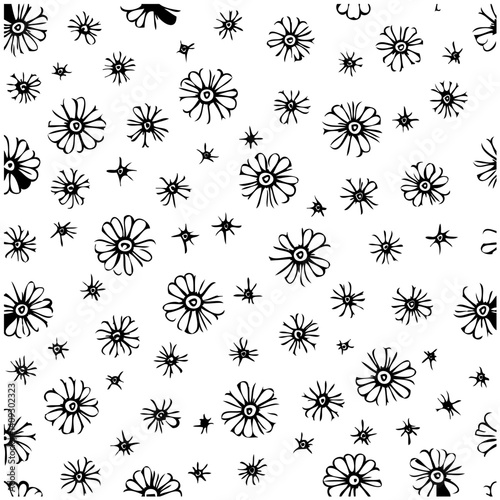 floral, scatter, seamless, pattern, illustration, flower, background, design, spring, summer, nature, texture, fabric, textile, decorative, surface, abstract, black, white, wallpaper, repeat, vector, graphic, hand-drawn, doodle, artistic, botanical, garden, bloom, drawing, ornate, monochrome, flourish, elegant, stylised, vignetting, organic, vintage, natural