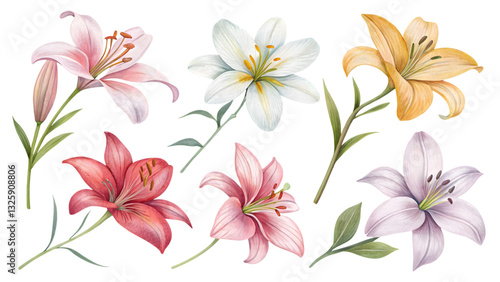 lily, flower, bloom, floral, blossom, flower petals, garden, nature, botanical, spring, bouquet, colours, vibrant, beauty, elegant, flora, fresh, realism, ornamental, plant, growth, detailed, design, collection, assorted, variety, illustration, delicate, beautiful, colourful, artistic, decoration, decorative, isolated, arrangement, stem, leaf, natural, bloom, closeup, elegance, art, watercolor, season, life, background, composition, pretty
