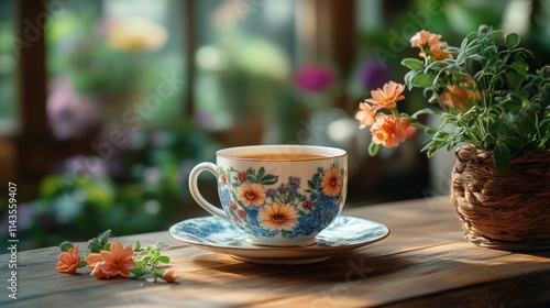 Floral teacup, saucer, flowers, wooden table, sunlight.
