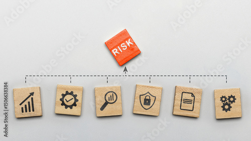 flowchart, risk, management, icon, wooden, cube, white, background, concept, chart, graph, arrow, gear, checkmark, checklist, magnifying glass, shield, padlock, key, file, business, strategy, leadership, finance, manager, success, investment, solution, planning, safety, control, analysis, assessment, idea, security, economy, leader, opportunity, insurance, problem, challenge, protection, working, growth, marketing, plan, financial, decision, process