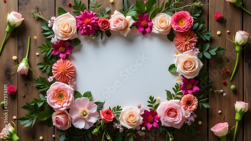 Flower frame on a wooden background. Flat lay, top view Generated by AI