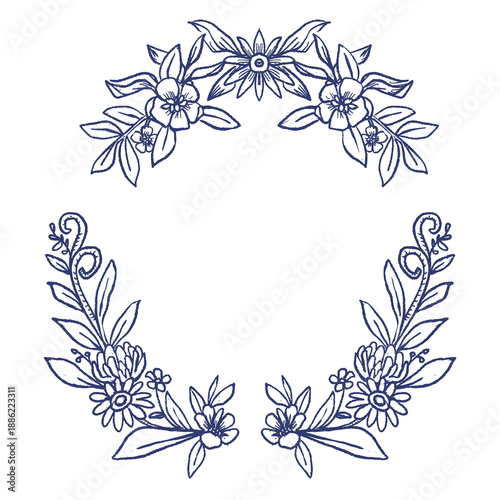 hi-res, design element, downloadable, high-quality, illustration, blank space, transparent, copy space, hand-drawn, botanical, printable, clip art, isolated, clip art, collage, cut-out, drawing, element, graphic, vintage, design, floral, flower, chaplet, frame, blue, leaf