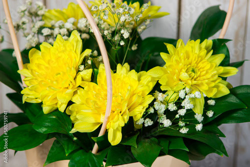 Flowers in a basket. Bouquet of yellow chrysanthemums