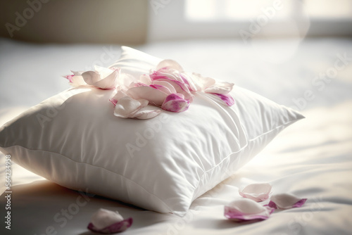 Flowers petals on a pillow lying on the bed in the morning sun. Generative AI.
