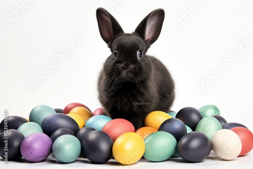 Fluffy black rabbit sits among colorful Easter eggs on white background. Spring and Easter celebration concept with space for text
