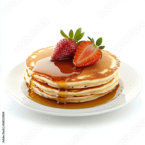 Fluffy pancake topped with syrup and strawberry isolated on white background.