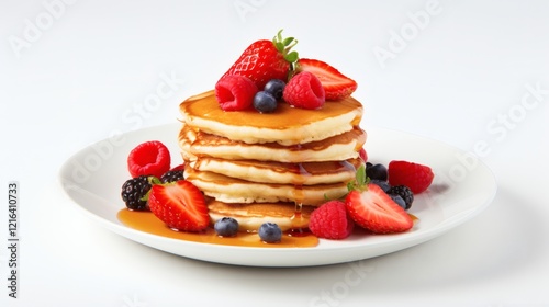 Fluffy pancakes topped with fresh berries and syrup served on a white plate