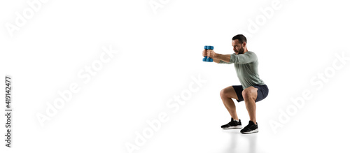 Flyer. Young caucasian male model in action, motion on white background with copyspace. Concept of sport, movement, energy and dynamic, healthy lifestyle. Training, practicing. Authentic.