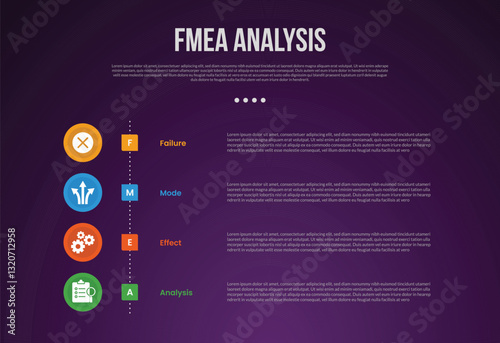 FMEA analysis infographic template with vertical timeline circle style dark background style with 4 point for slide presentation